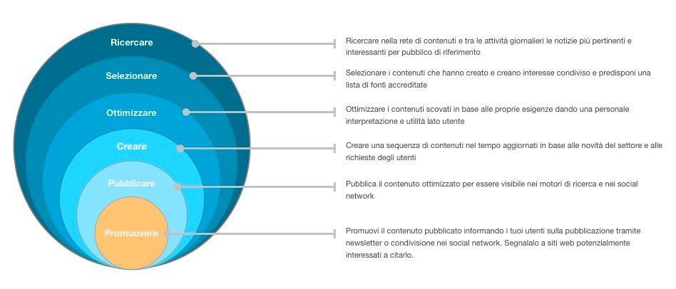 Se si riuscisse a costruire un piano editoriale per dare risposta a questi bisogni, utilizzando le indicazioni di ottimizzazione dei contenuti, avremmo intrapreso il percorso giusto per creare nel tempo un sito web di qualità. Un classico schema di gestione del content e curation marketing prevede le seguenti fasi progettuali.