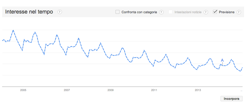 I dati di Google Trends per categoria “Viaggi” dal 2004 in poi in Italia, mostrano chiaramente come negli anni il volume di ricerche per parole chiave generiche (il primo scenario) sono in costante decrescita